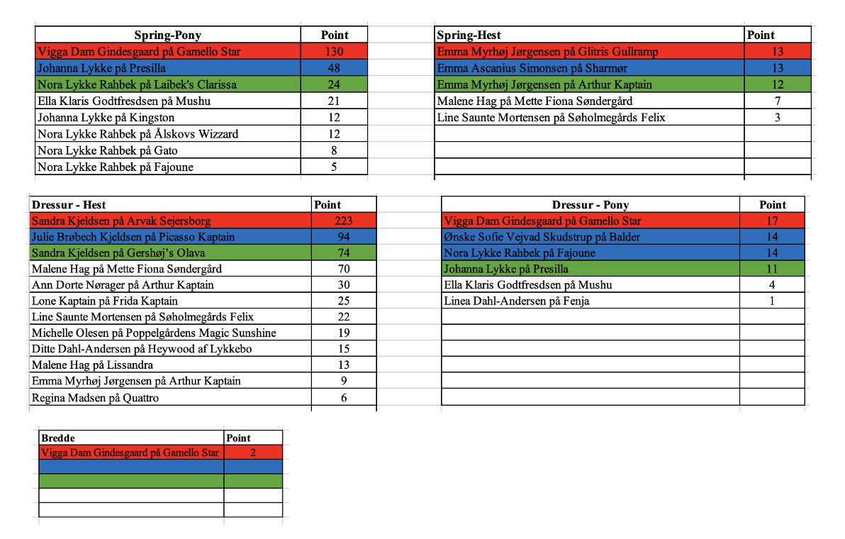 Skema for point til spring og dressurstævner: